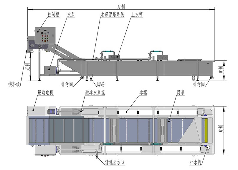 3)水产品包冰衣机根据冻品不同,设计不同深度的水位;